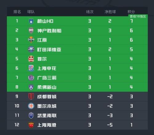 中超球队中申花2-0力克首尔,成功升至积分榜第6位,成都输球后掉至第9,海港则因为输球+墨尔本城战胜武里南联跌至垫底位置。