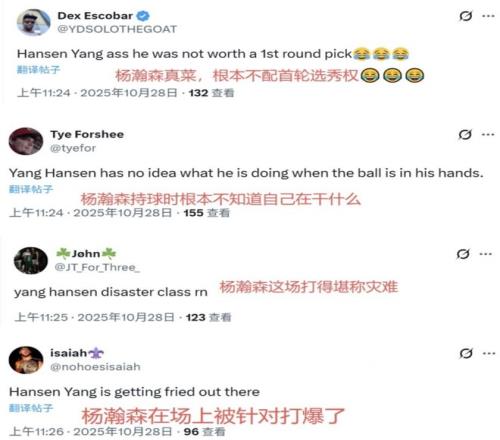 美国网友也是再次集体批评杨瀚森,他们都纷纷对于杨瀚森第1节的发挥很不满意,并且直截了当的发话:“杨瀚森挡完拆之后,面对贝利简直就是像是一只待宰的羔羊!”还有人说:“杨瀚森真的应该离开NBA了。”、“杨瀚森的表现真的是太差了,你在场上是在干什么呢?”